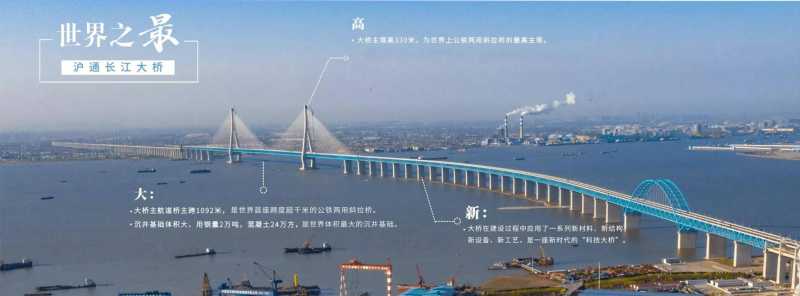 沪通长江大桥主跨长度达1092米,比苏通大桥主跨长4米,比主跨504米、创下公铁两用桥跨度世界之最的武汉天兴洲长江大桥还长一倍多,是世界首座跨度超千米的公铁两用桥,还是世界上载重量最大的桥梁。大桥主塔高325米,相当于100层楼高。预计2019年建成通车。