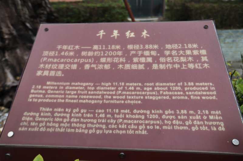 千年红木,树高11.18米,根径3.88米,地径2.18米,顶径1.46米,树龄约1200年,重达3.8万公斤,材质为大果紫檀。