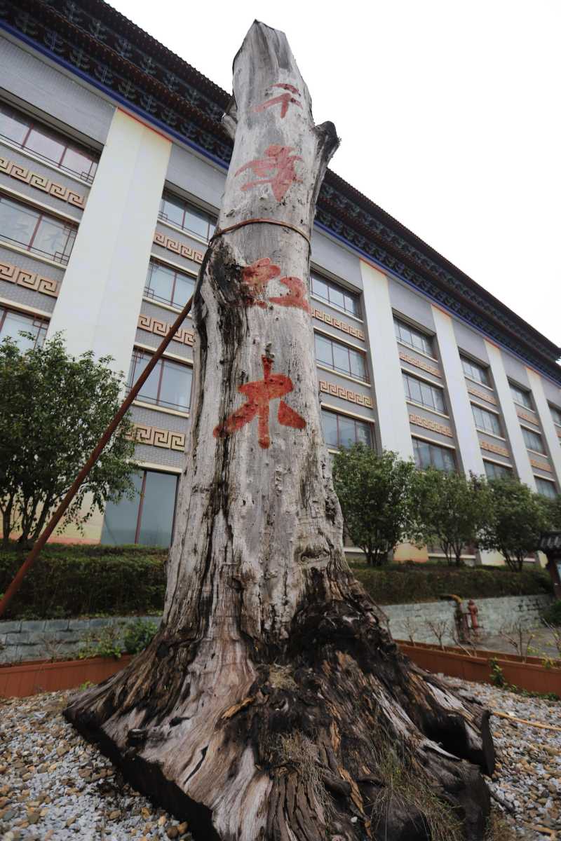 刚走进中国红木第一城,映入眼帘为一棵巨大的木头,上面写有“千年神木”四个大字。