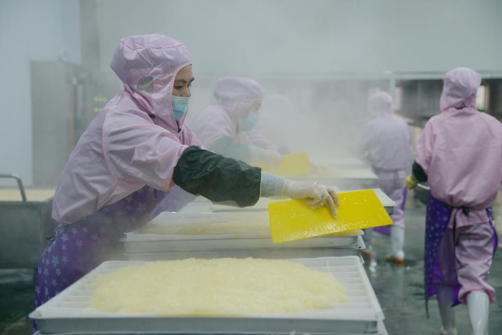 冻干银耳羹生产车间里的工人们正将熬制完成的银耳羹装入模具。新华社记者李昊泽 摄