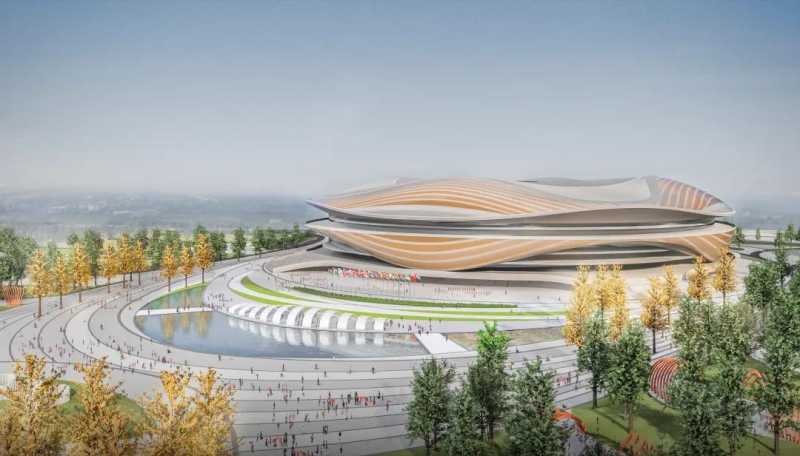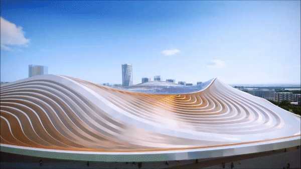 根据看台轮廓向内收缩的体量形成四个入口广场向广场打开的拱形入口如黄河之潮上下蹿腾营造仪式感的入场氛围。