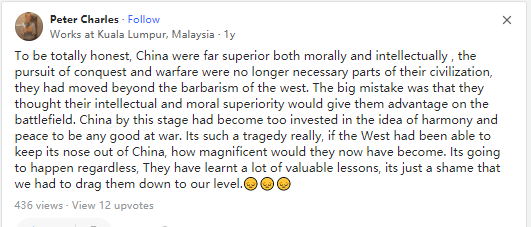 马来西亚网友Peter Charles回答道:老实说,中国在道德和智力上都远超西方,征服和战争不再是他们文明的必要组成部分,他们已经超越了西方的野蛮。最大的错误是,他们认为自己的智力和道德优势会给他们在战场上带来优势。到了这个阶段,中国已经对和谐与和平的理念投入太多,不适合战争。百年耻辱是一场悲剧,如果西方能够对中国置若罔闻,他们现在会变得多么壮丽。不管怎样,这都会发生,他们已经吸取了很多宝贵的教训,我们已经把中国拖到我们的水平,这真是太遗憾了。