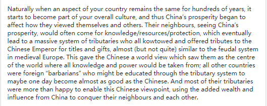 自然,当你们国家的某一方面保持数百年不变时,它开始成为你们整体文化的一部分,因此中国的繁荣开始影响他们对自己和他人的看法。他们的邻国看到了中国的繁荣,往往会来寻求知识、资源、保护,这最终导致了一个庞大的朝贡体系,所有朝贡者都向中国皇帝叩头致敬,以获得头衔和礼物,几乎类似于中世纪欧洲的封建制度。这给了中国人一种世界观,认为他们是世界的中心,所有的知识和权力都将从这里获得;所有其他国家都是外国“野蛮人”,他们可能会通过朝贡体系接受教育,也许有一天会变得和中国人一样好。他们的大多数支流都非常乐意支持这种中国观点,利用中国带来的财富和影响力征服邻国和彼此。