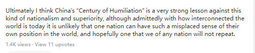 归根结底,我认为中国的“百年屈辱”是对这种民族主义和优越感的一个非常深刻的教训,尽管不可否认,当今世界的联系如此紧密,一个国家不太可能对自己在世界上的地位有如此错误的认识,希望我们任何国家都不会重复。