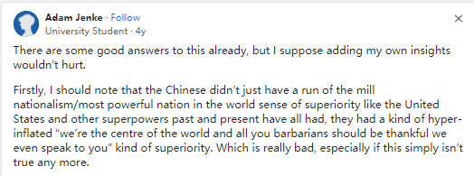 首先,我要指出的是,中国人不只是像美国和其他超级大国过去和现在所拥有的那样,有一种普通的民族主义或者说世界上最强大的国家的优越感,他们有一种夸大了“我们是世界的中心,你们所有的野蛮人都应该感谢我们甚至和你们说话”这种优越感。这真的很糟糕,特别是如果这不再是真的。