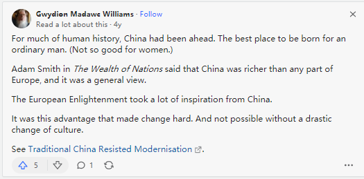 英国网友Gwydion Madawc 威廉姆斯回答道:在人类历史的大部分时间里,中国一直处于领先地位。一个普通人最好的出生地,虽然对当时的女性来说不太好。亚当·斯密在《国富论》中说中国比欧洲任何地方都富有,这是普遍看法。欧洲启蒙运动从中国汲取了很多灵感。正是这种优势使变革变得困难重重。如果没有文化的剧烈变化,这是不可能的。