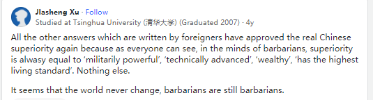 毕业于清华大学的徐佳生回答道: 其他所有洋人写的答案,都再次认可了中国人真正的优越感,因为大家可以看到,在野蛮人的心目中,优越感永远等同于“军事强大”、“技术先进”、“有钱人”、“富人”。最高生活水平”。没有其他的。似乎世界从未改变,野蛮人仍然是野蛮人。
