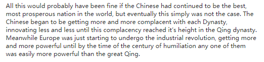 如果中国继续成为世界上最好、最繁荣的国家,这一切可能都会很好,但最终情况并非如此。中国人开始对每个朝代越来越自满,创新越来越少,直到这种自满在清朝达到顶峰。与此同时,欧洲刚刚开始经历工业革命,变得越来越强大,直到本世纪末,他们中的任何一个都比大清帝国更强大。