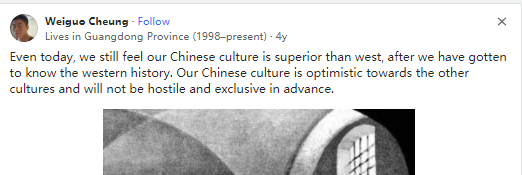 中国网友张伟国回答道:即使在今天,我们在了解了西方历史之后,仍然觉得我们的中国文化比西方优越。我们中国文化对其他文化是乐观的,不会事先敌对和排他。