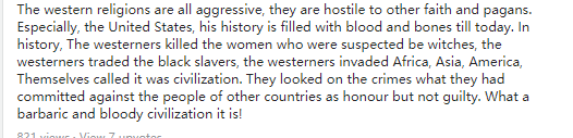西方宗教都是侵略性的,他们敌视其他信仰和异教徒。尤其是美国,他的历史直到今天都是血肉模糊的。历史上,西方人杀害被怀疑是女巫的女人,