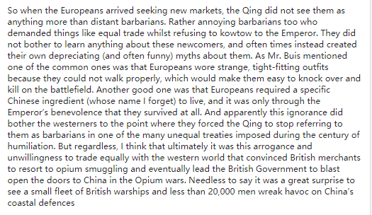 他们并没有费心去了解这些新来者的任何情况,而是常常创造出自己贬低他们的神话。正如布伊斯先生所提到的,一个常见的问题是欧洲人穿着奇怪的紧身服装,因为他们不能正常行走,这会使他们在战场上很容易被击倒并被杀害。另一个好的例子是,欧洲人需要一种特定的中国成分(我忘记了它的名字)才能生存,而只有通过皇帝的仁慈,他们才得以生存。显然,这种无知确实让西方人感到困扰,以至于他们迫使清朝停止在屈辱的世纪中强加的许多不平等条约中称他们为野蛮人。但无论如何,我认为,最终正是这种傲慢和不愿意与西方世界平等贸易的态度说服了英国商人诉诸鸦片走私,最终导致英国政府在鸦片战争中向中国敞开大门。不用说,看到一支由英国军舰组成的小舰队和不到两万人对中国的海岸防御系统造成破坏,这是一个巨大的惊喜。