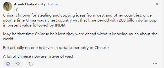 印度网友阿纳布查克拉博蒂回答道:中国以窃取和复制西方和其他国家的思想而闻名,曾几何时,中国是当时最富有的国家,其现值为200亿美元,印度紧随其后,也许是那个时候,中国人在对世界一无所知的情况下认为自己领先,但实际上没有人相信中国人的种族优越性。现在许多中国人对西方感到敬畏。