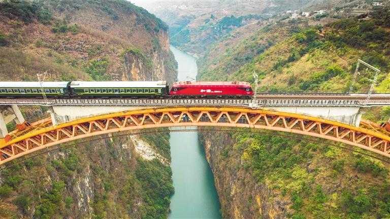 水城至柏果铁路北盘江大桥是国内首次将钢管混凝土拱用于铁路桥梁,建成时为世界上跨度最大的铁路钢管混凝土拱桥,施工所采用的钢与填充聚四乙烯复合滑片作为摩擦副的转体球铰为世界首创。(贵州日报天眼新闻记者 何晓璇 摄)