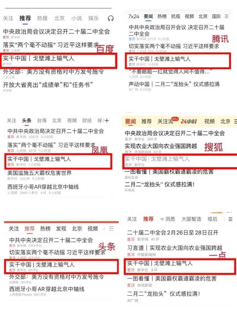 新华社客户端现场云、今日头条、腾讯新闻、百度新闻、凤凰新闻、一点资讯、搜狐新闻等平台,集体置顶《实干中国 | 戈壁滩上输气人》。