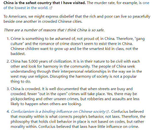 中国是我去过最安全的国家。例如,谋杀率是世界上最低的之一。