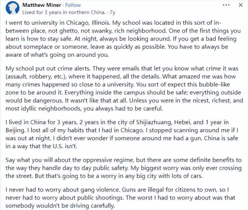我在中国住了三年。河北省石家庄市2年,北京市1年。我失去了我在芝加哥的所有习惯。如果我晚上出去,我就会停止环顾四周,我从没想过我周围的人是否有枪,中国在某种程度上是安全的,而美国则不然。