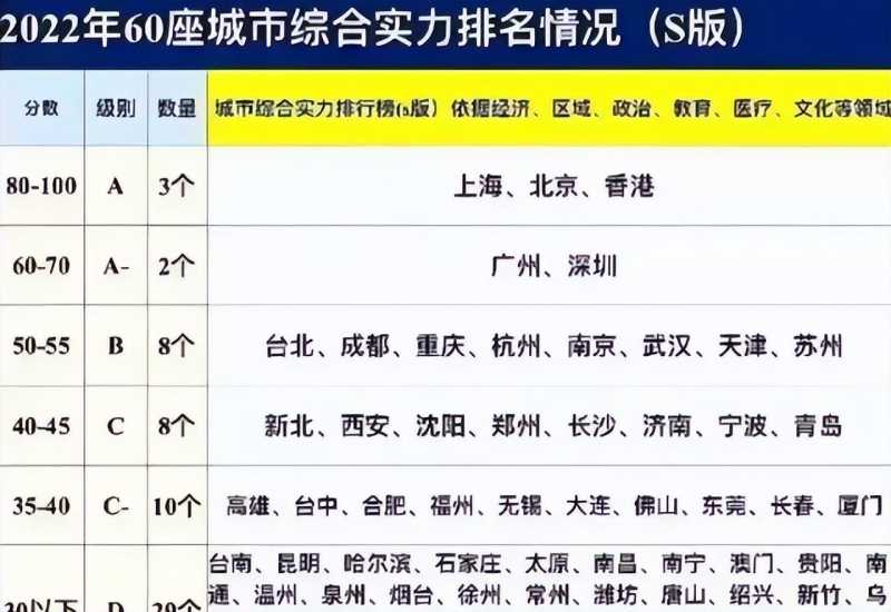 这就是中国最强的综合实力一共60个城市,共6级:台北→3级,少于广州和深圳。