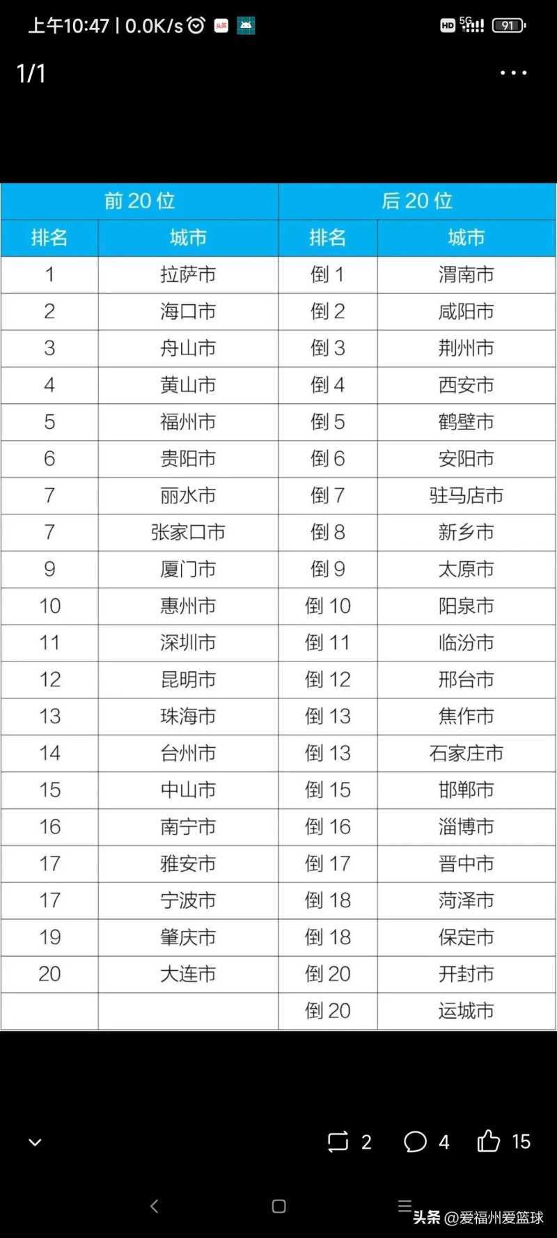 除了高原的拉萨和海岛的海口,福州在全国省会城市空气质量排名中位列第一!