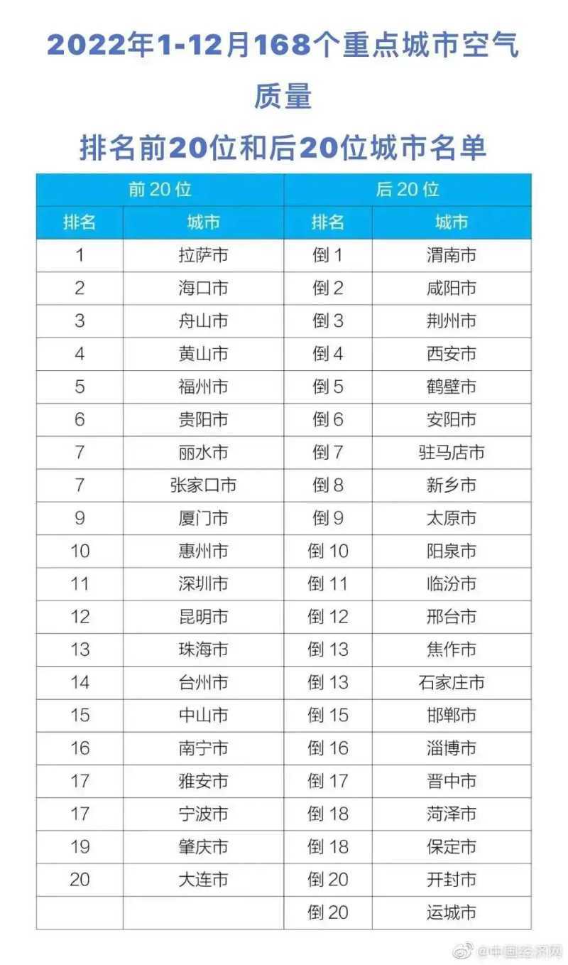 近日公布168个重点城市2022年1-12月空气质量情况前三名分别是拉萨、海口和舟山排名后20名中没有唐山的迹象。