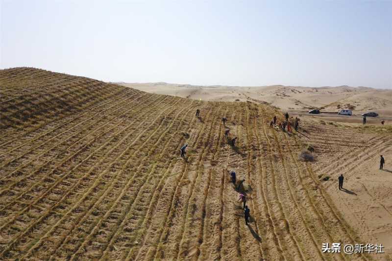 在甘肃省武威市古浪县北部沙区旱麻岗治沙点,八步沙林场治沙人和群众一起扎草方格压沙(2020年3月6日摄,无人机照片)。新华社记者 范培珅 摄