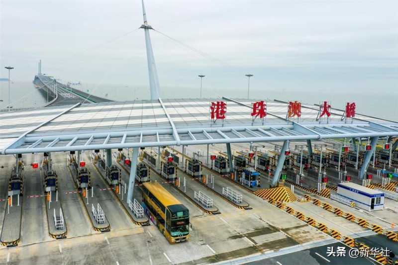 一辆从香港开往珠海的港珠澳大桥穿梭巴士入境珠海(2023年1月8日摄,无人机照片)。新华社记者 刘大伟 摄