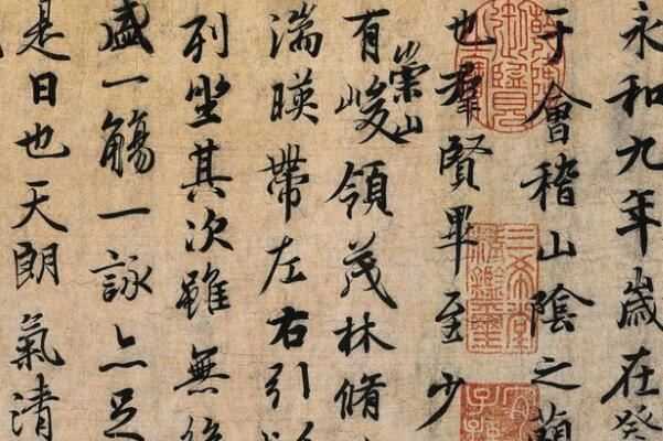 这幅书法作品有着天下第一行书美称,是由书法家王羲之创作于永和九年三月初会稽山阴的序文手稿,长72厘米,宽232厘米,后来唐太宗还将其推送为尽善尽美,据传还将其真迹殉葬。