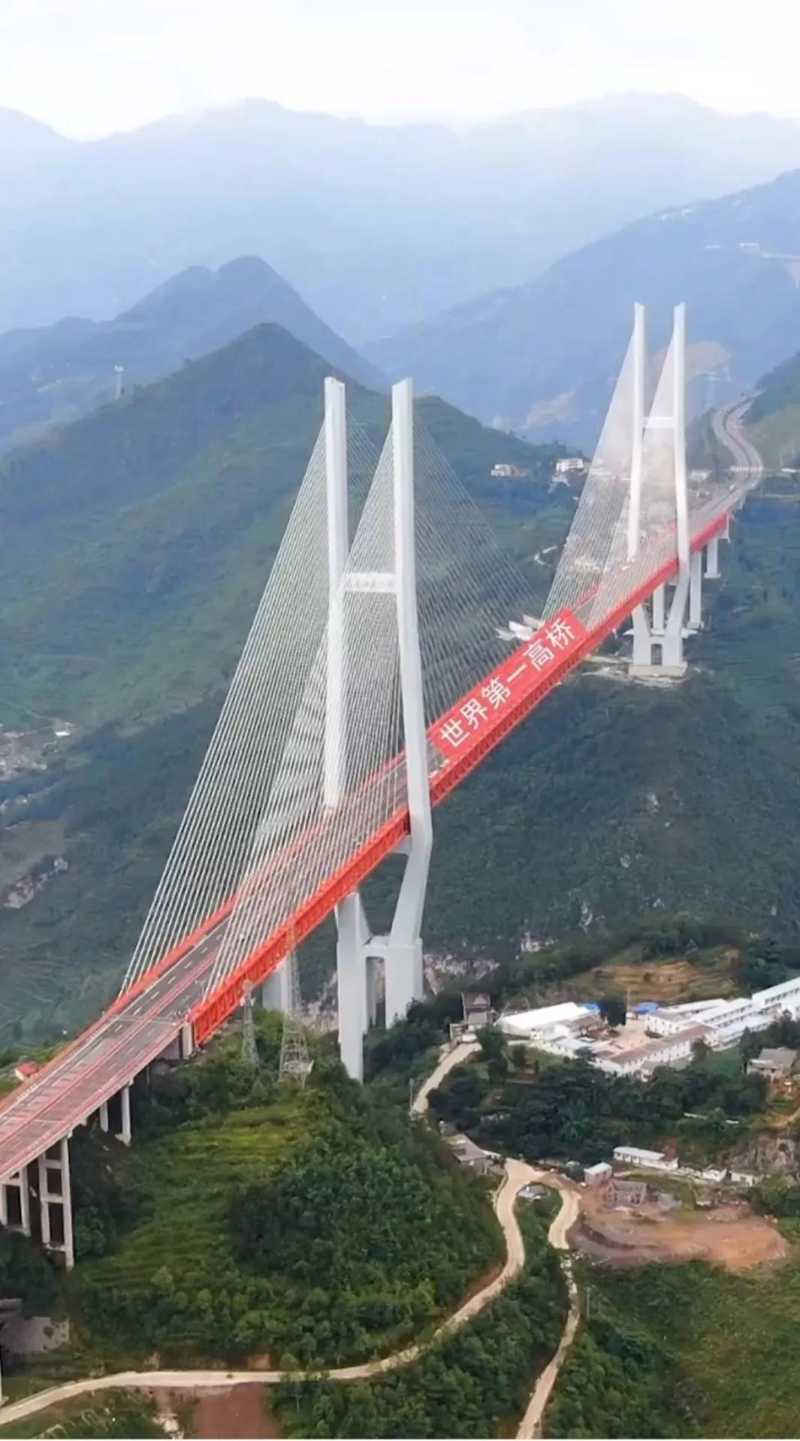 第三,世界最高的桥梁前20名里,中国占了14座。其中贵州省北盘江大桥是目前世界上最高的桥梁,是杭瑞高速公路的组成部分,4车道的杭瑞高速,桥面距离地面高度达到了565米。