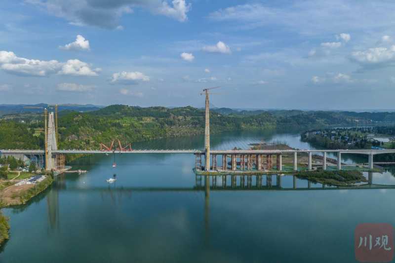 该桥以335米的主跨横跨嘉陵江,是目前全国在建跨度最大的双线高速铁路高低塔混合梁斜拉桥。