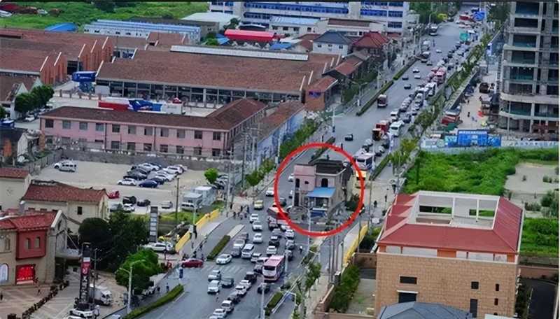在上海松江九亭沪亭北路的马路中央,一座三层楼房孤鹜的屹立在那里。