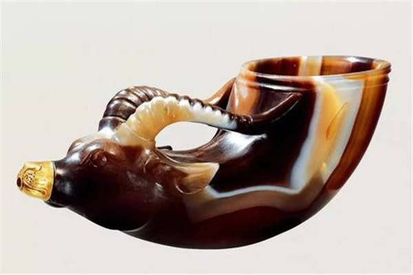 唐兽首玛瑙杯是唐朝十大文物之一,是当时的唐朝对外交往的产物,材料上乘,俏色纹理精雕细琢,是我国首批禁止处境展览的文物,可见其价值。