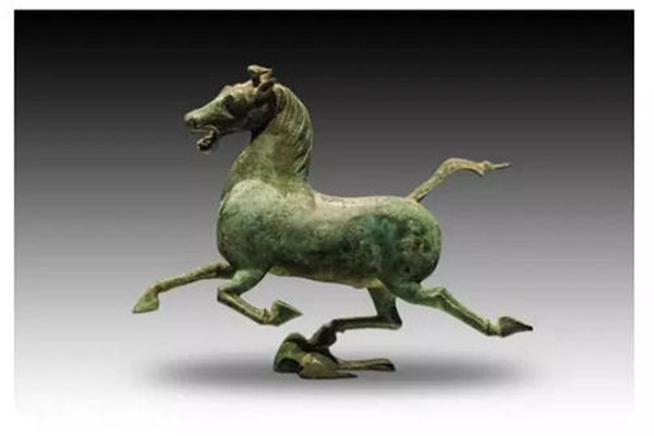 东汉铜奔马也称马踏飞燕,造型为一匹矫健非凡的骏马昂首飞驰,非常生动而精巧,既体现了东汉时期青铜艺术的高妙,又展现了那时候的人民积极昂首的风貌。