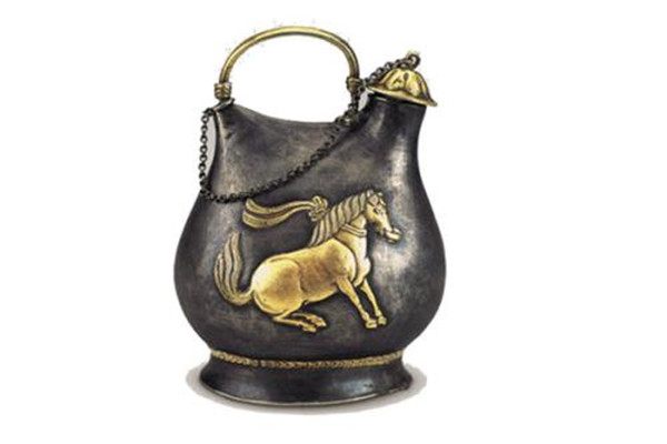 唐鎏金舞马衔杯纹银壶是唐朝时期十分珍贵的一件文物,为金银制品,它的造型是一个游牧民族水囊,纹饰雕刻都很精美,中部还有凸出的一匹舞蹈的马。