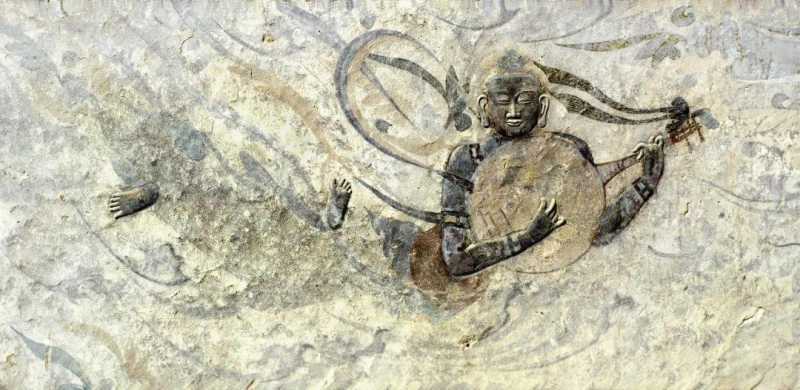 第4窟顶部薄肉塑伎乐飞天,北周时期。
