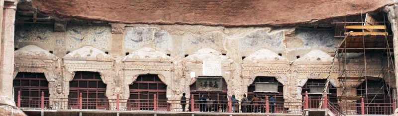 代表性窟龛主要有第4、9、12、15、22、26、27、141等窟,主要集中在东崖。仿殿堂式窟在这一时期达到顶峰,如东崖上部的第4窟,俗称“上七佛阁”或“散花楼”,系大型庑殿顶,前廊后室、七间八柱式结构,面阔30.48米、进深8.00米、通高16.00米,平棋、斗栱、额枋、瓦垄、正脊、鸱吻等建筑构件一应俱全。后室由七个装饰华丽的帐形大龛组成,富丽堂皇。