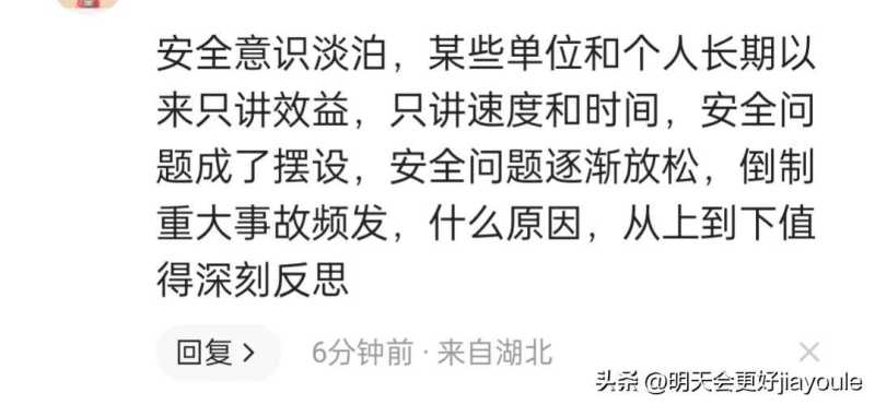 还有一位来自于湖北的网友表示:大货车司机安全意识淡薄,某些单位和个人长期以来只讲效益,只讲速度和时间,安全问题成了摆设,安全问题逐渐放松,导致重大事故频发,什么原因,从上到下值得深刻反思。