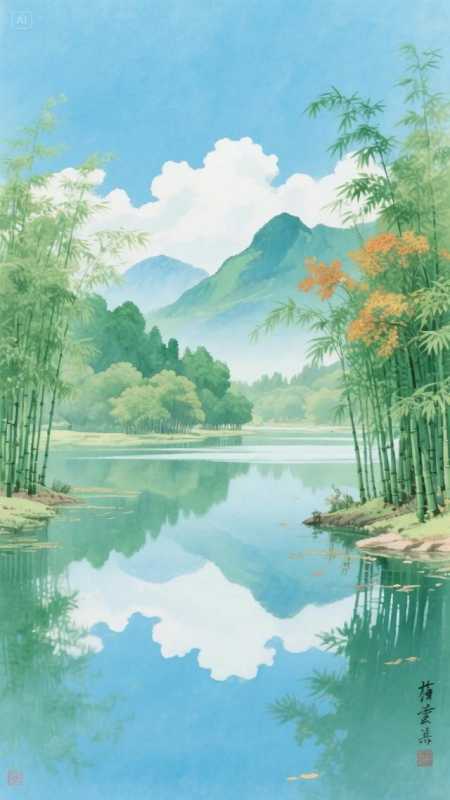 湖的两侧,竹林郁郁葱葱。修长的竹子挺拔而立,竹叶在阳光的照耀下闪烁着生机。风过处,竹叶沙沙作响,似在私语着山林的故事。其间几棵树木,叶子呈现出明艳的橙黄,像是大自然打翻了调色盘,在这一片翠绿中点缀出别样的绚烂。