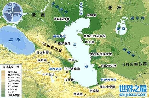 最大的湖泊及咸水湖:里海(面积达371,000平方公里)