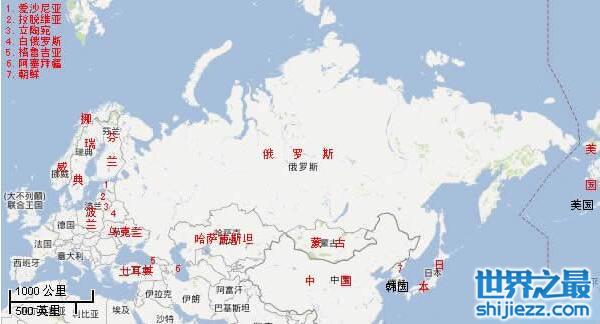 海陆领国(8个):挪威、芬兰、爱沙尼亚、乌克兰、格鲁吉亚、立陶宛、朝鲜、波兰。