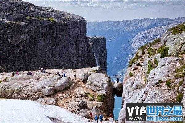 谢拉格伯顿石位于挪威的谢拉格山,世界著名的平衡石。它夹在两侧山峰之间,面积大约有5平方米,看上去摇摇欲坠,像是马上就会掉下去的样子,但其实这块石头已经屹立在这里数百年了。曾经,会有当地的牧羊人从这块石头上经过,翻越两座山峰之间。但是并不是每个人都敢这么做的,因为这块石头的底下就是3000英尺深的峡谷。