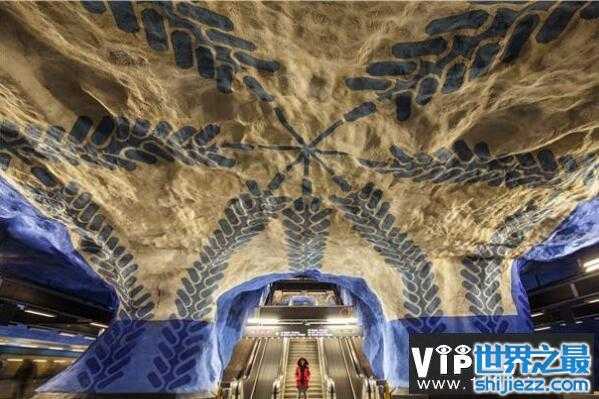 这处建设在瑞典境内的地铁站,是以专供王室种植花卉蔬菜的田地为基础建设的,因其中保存着很多旧时Makalös宫殿遗址,其中保存的众多浮雕、雕塑、铁艺等作品均体现着此处悠久的历史信息,展现出了瑞典人对于岩洞的执着和自然地敬畏。但是与“红色天空”不同的是,它展现出了更多的艺术性。