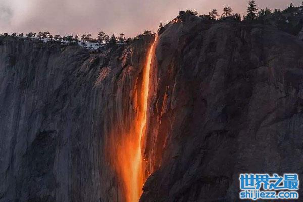 马尾瀑布位于美国加利福尼亚州优胜美地国家公园内,是一个季节性瀑布”。这座瀑布只有在日落余辉的映照下才能发挥它真正的魅力,据只要角度合适,当太阳的余晖照射在瀑布上的时候,瀑布就会变为犹如熔岩般一泻而下,看起来非常像一团火焰,十分的新奇,这也就成为了著名美国自然奇观之火瀑布。