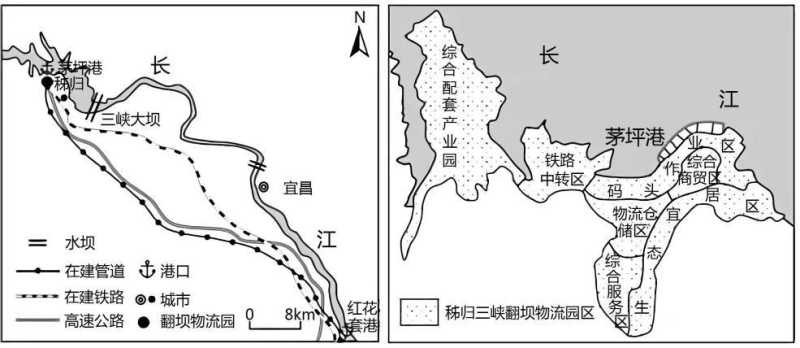 (2022·湖北·黄冈中学二模)“翻坝”运输是指来往的客船、集装箱船、汽车滚装船等船舶或运输紧急物资和鲜活食品的船舶,在候闸船舶过多的情况下,为避免花费较长时间候闸过坝,而采用的“水运→陆运→水运”或“水运→陆运”的转运方式。左图示意三峡翻坝物流系统,其中秭归三峡翻坝物流图(含茅坪港)属于货运枢纽型的港口物流园区(右图),是长江南岸三峡翻坝物流转运的空间载体和依托。据此完成下面小题。