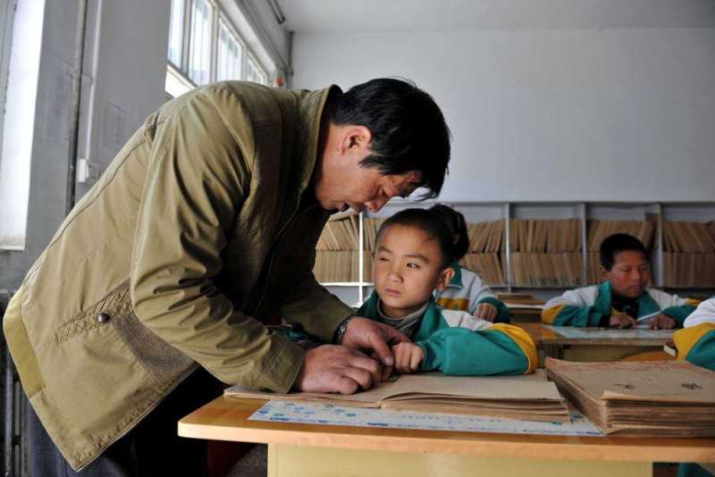 ↑陵川县盲人曲艺宣传队特教班老师李志臣指导王文杰学习盲文(2015年10月15日摄)。