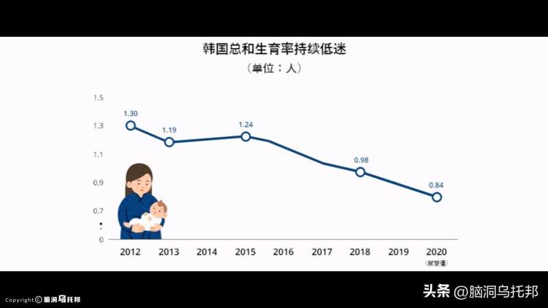 2018年,韩国生育率首次破1,跌至0.98. 2020年,韩国生育率创世界最低记录,跌至0. 84。