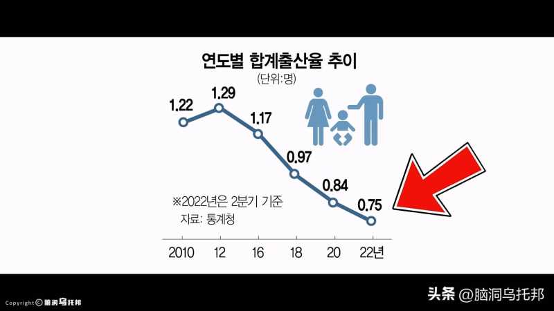 2022年8月,韩国统计厅发布数据,截止到2022年上半年,韩国的出生率已经下降到了0.75. 。