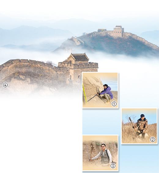图①:鲁婷婷在对万里长城第一墩进行测量检测。 本报记者 王锦涛摄 图②:郭洪秀用铲刀劈开荆棘。 本报记者 张腾扬摄 图③:尚珩在陕北长城考察中测量夯层厚度。 程长进摄 图④:河北省承德市滦平县金山岭长城景观。 周万平摄(人民视觉)
