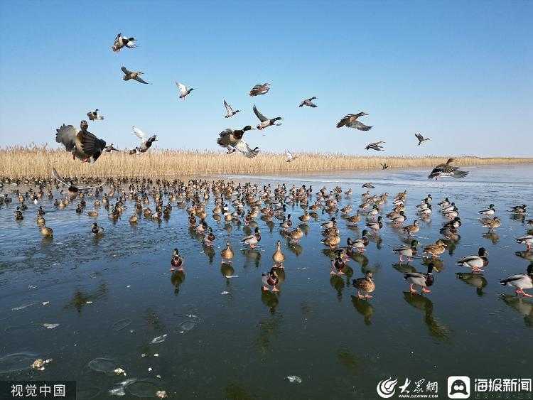 2022年12月18日,黄河三角洲湿地核心区出现由绿头鸭、雁鸭以及黑头鸭组成的大片野鸭群。