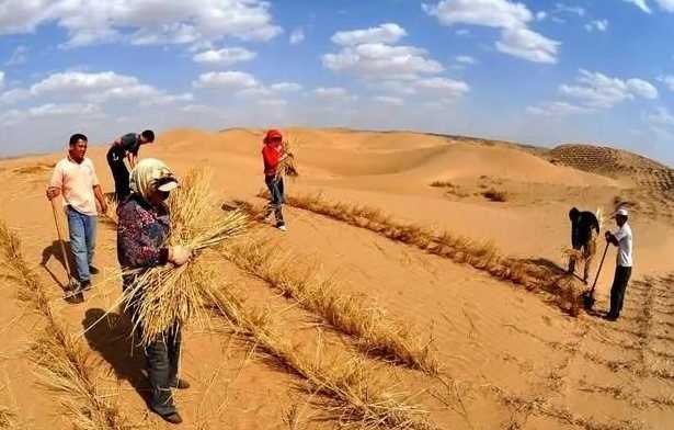 把麦草等按照方格形状埋进沙里,形成网状防护带后,就能起到固定沙土的作用了。然而仅用麦草,还是不保险。为了防流沙,还要在光伏板阵之间,种上各种灌草类植物。