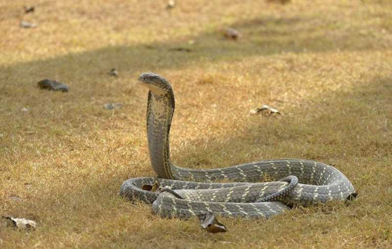 眼镜王蛇抬起头来展示其喇叭形兜帽和有毒的尖牙,它的毒液足以杀死一头大象。原产于亚洲,眼镜王蛇可以长到5 米长,除非在南亚和东南亚的丛林中旅行,否则不太可能遇到太大的眼镜蛇。眼镜王蛇是世界上最长的毒蛇,平均长度在 3 到 4 米之间。