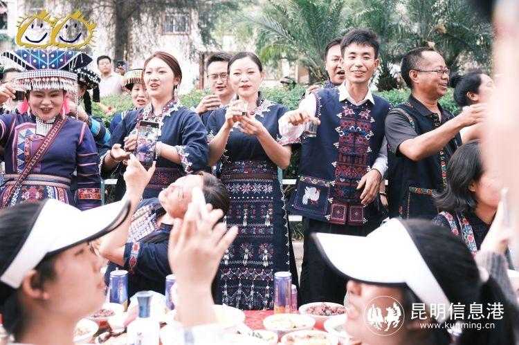 宴席的菜肴主要是本地的特色菜,墨江紫米鸡,香甜的哈尼特色麻脆,软而不烂的神腿,天然植物染色的糯米饭......席间,身着盛装的哈尼人,沿着长龙一般的桌子,在铓声、鼓声、唢呐声中热情地一边舞着一边唱着祝酒歌,祝愿远道而来的客人幸福安康,万事如意,在墨江能有宾至如归的感觉。客人们在歌声中与哈尼人民齐举杯,相互祝福着,欢笑着。
